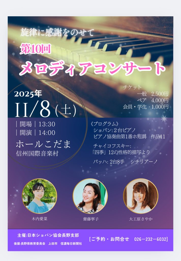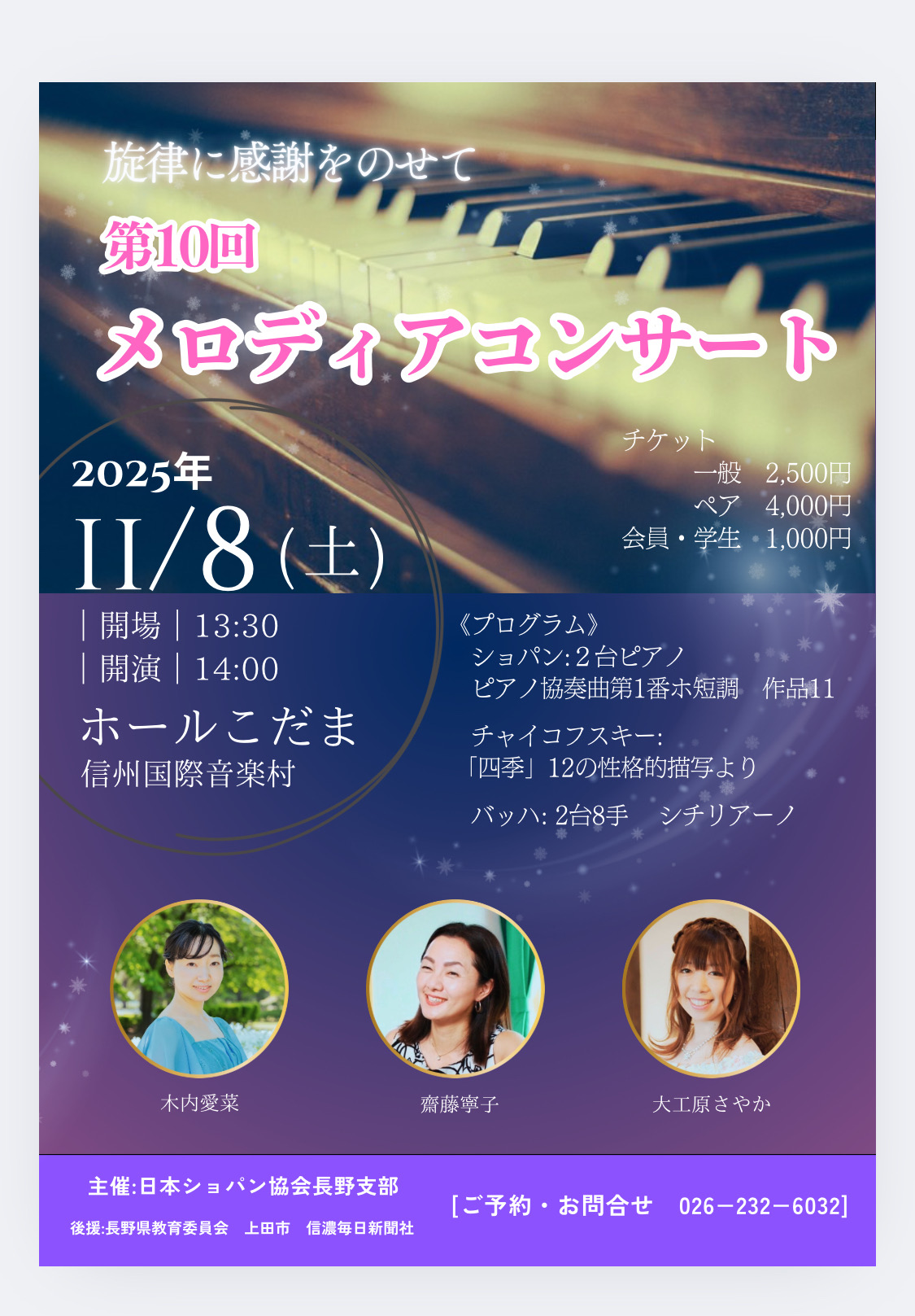 お陰様でこの度メロディアコンサートは第10回目を迎えます。旋律に感謝をのせて、ピアノソロ、2台ピアノ、2台8手の演奏による特別なプログラムでお送りいたします。