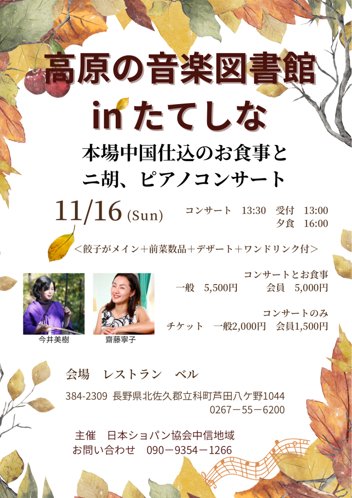 高原の音楽図書館 in たてしな 第2回目は、今井美樹さんと、齋藤寧子さんによる、二胡とピアノのお食事付きコンサートです。只今お食事はおかげさまで満員となりましたが、コンサートのご予約、お問い合わせは日本ショパン協会中信地域090-9354-1266までどうぞ。